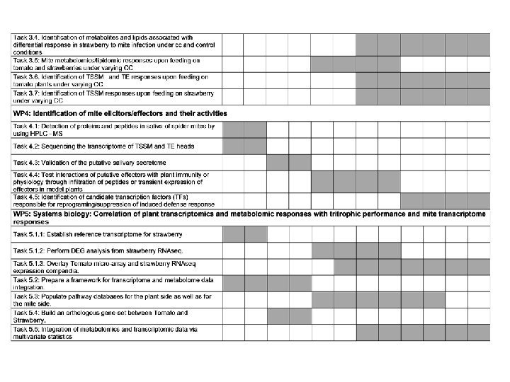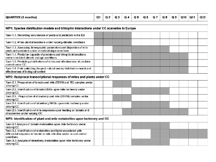 PROGRAMME 09: 00 FACCE JPI ERA NET + and project Mission (J Cross, M Grbic) 09: 15 Project management (technical and financial) (J Cross) Obligations/Expectations of FACCE JPI and National Authorities, Governance structure Collaboration agreement, Mailing list 10: 00 Review of workpackages 15 minutes presentation by WP leader + ½ hour discussion for each WP) WP 4. Identification of mite elicitors/effectors and their activities. WP leader: Thomas van Leeuwen, Uv. A 10: 45 Break 11: 15 Review of workpackages (continued) WP 1: Species distribution models and tritrophic interactions under CC scenarios in Europe. WP leader: Maria Navajas, INRA WP 2: Reciprocal transcriptional responses of mites and plants under CC. WP leader: Isabel Diaz, UPM 12: 45 Lunch 13: 45 Review of workpackages (continued) WP 3. Identification of plant and mite metabolites upon herbivory and CC. WP leader: Lothar Willmitzer, MPI WP 5. Systems biology: Correlation of plant transcriptomics and metabolomic responses with tritrophic performance and mite transcriptome responses. WP leader: Yves van de Peer, VIB. 15: 15 AOB 15: 30 End