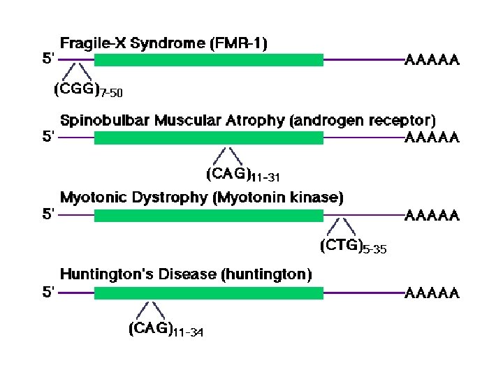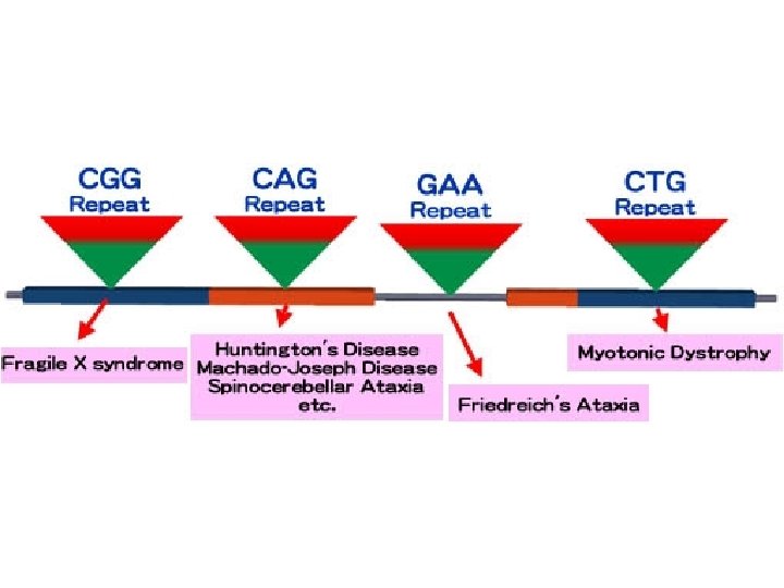 GENOTOSSICOLOGIA SPECIE DI DANNI GENETICI Mutazioni geniche E’ stato individuato un terzo tipo di mutazione chiamato “ripetizione della tripletta”. E’ amplificato un particolare trinucleotide (e. g. CTG/CTG/CTG). Sono coinvolte in numerose malattie genetiche quali la distrofia miotonica, la malattia di Huntington e la sindrome dell’X fragile.