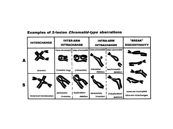 GENOTOSSICOLOGIA SPECIE DI DANNI GENETICI Aberrazioni cromosomiche Oltre a aberrazioni stabili, le rotture cromosomiche danno origine a frammenti acentrici (pezzi rotti senza centromero), cromosomi dicentrici, cromosomi ad anello e altri riarrangiamenti asimmetrici che sono instabili e causano morte cellulare.