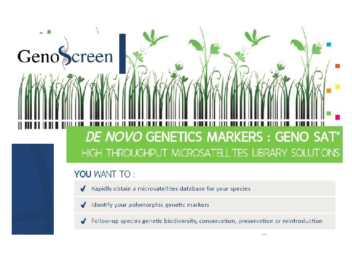 Optimalizace mikrosatelitů v současnosti = NGS n „next-generation sequencing“ – velice rychlá sekvenace stovek tisíců fragmentů z jakéhokoliv genomu n vyhledání repetitivních sekvencí vhodným softwarem a navržení primerů n identifikace nových mikrosatelitů rychle, elegantně a relativně levně (1500 EUR ? )