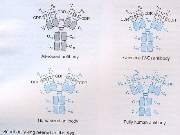 Chimerické a humanizované protilátky Ø Rekombinantní protilátky humánní-hlodavčí Ø Humanizace hlodavčích m. Ab umožňuje získat velké množství protilátek a zároveň zabránit imunitní odpovědi lidského příjemce: Ø chimerické V/C protilátky) Ø CDR (complementarity determining regions) graft protilátky Ø Infekční patogeny a antigeny nádorových buněk