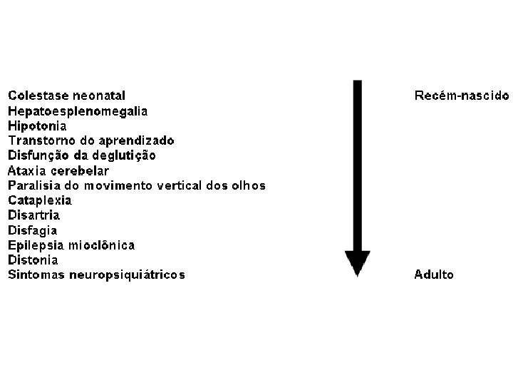 D. Niemann-Pick C Paralisia do olhar vertical Infantil precoce Hipotonia a. DNPM Infantil tardio Alteração da marcha Atraso de fala cataplexia Juvenil Atraaso escolar Ataxia Convulsão Cataplexia