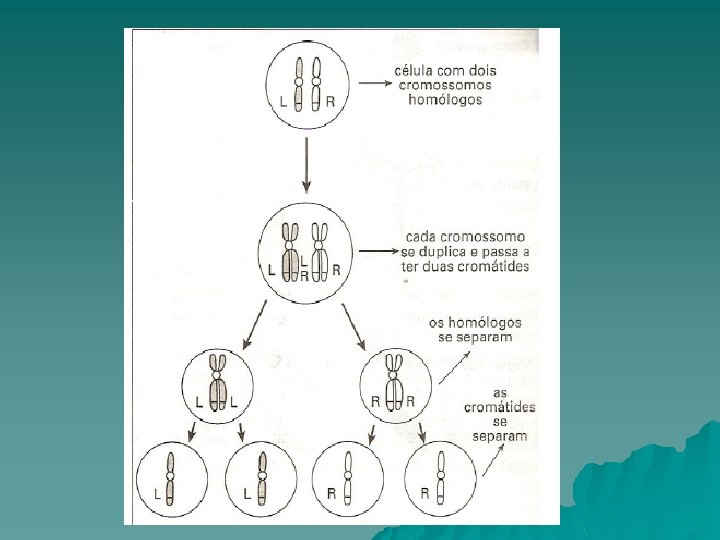 AS ERVILHAS… Mendel iniciava o cruzamento com variedades diferentes entre si mas sempre puras. • Na primeira geração de filhos, todos apresentavam sementes lisas; • Cruzando essa primeira geração entre si, obteve-se plantas com sementes lisas o outras com rugosas; • O caráter liso foi dito dominante, e o rugoso recessivo. • Chamou-se de L o fator para liso e de R o fator para rugoso.
