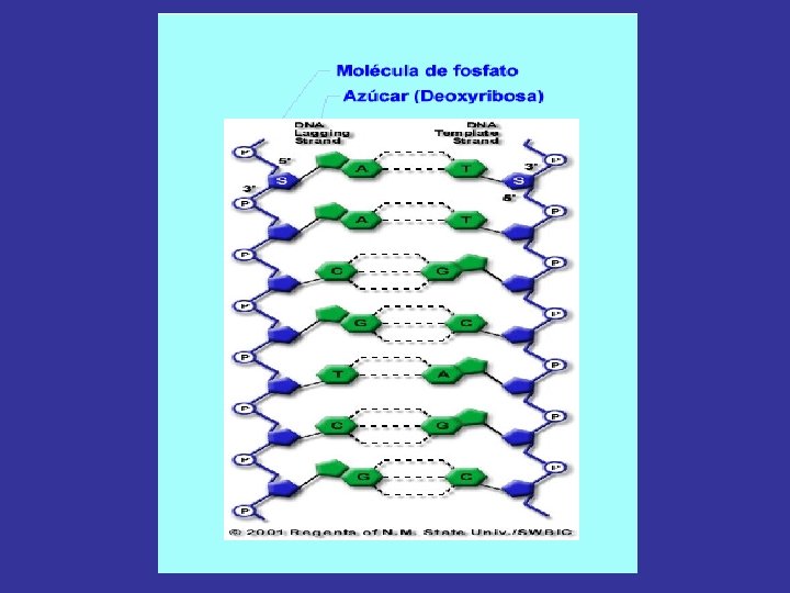 Características del ADN Relación estructura - función üReplicación üAlmacenaje de la información üExpresión de esta información. üVariación por mutación (Mutación génica, estructural y numérica)