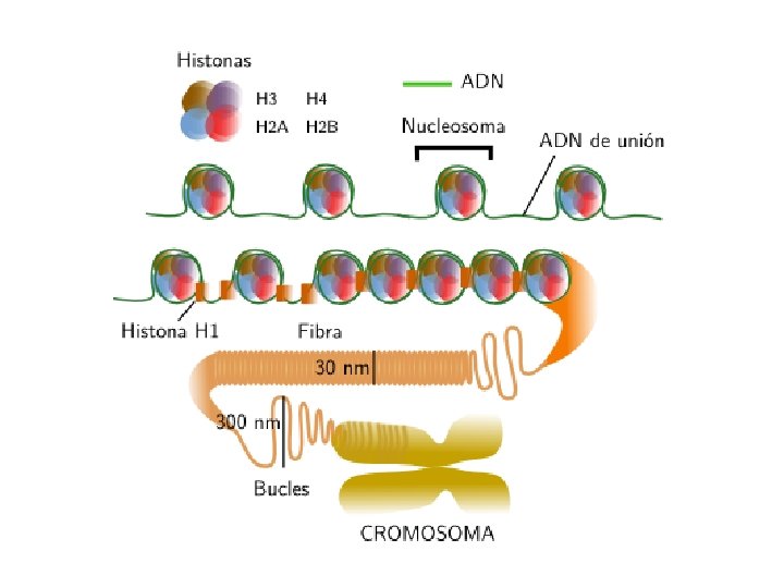ADN a cromosoma 2 nm Doble hélice 10 nm nucleosoma 30 nm solenoide Andamio o scaffold Cromosoma metafásico supersolenoide 300 nm Cromatina interfásica 700 nm