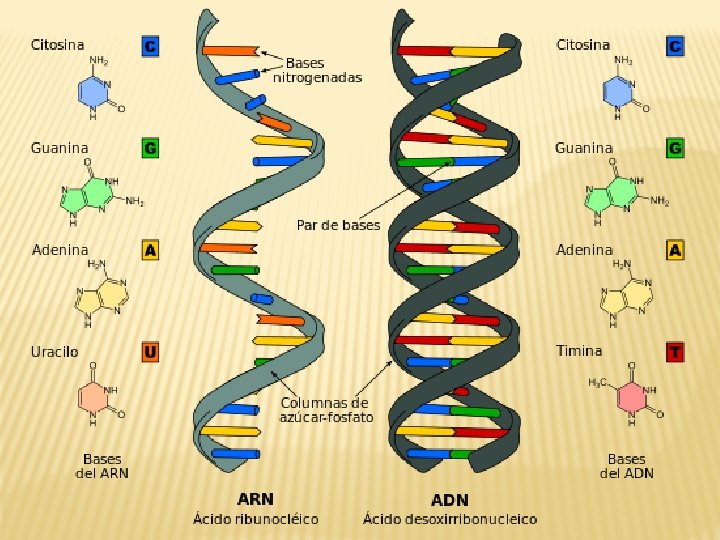 • • • ADN Y ARN El ADN es la base material de la información genética Tanto el ácido desoxirribonucléico (ADN) como el ribonucléico (ARN) son macromoléculas clasificadas como ácidos nucleicos compuestas por largas cadenas de nucleótidos. Un nucleótido tiene tres componentes: una azúcar pentosa (porque tiene 5 átomos de carbono); un grupo fosfato y una base nitrogenada de cuatro posibles que varía según se trate de molécula de