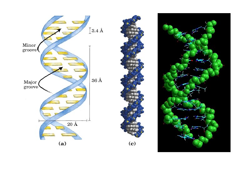 ADN-B: ADN en disolución, 92% de humedad relativa, se encuentra en soluciones con baja fuerza iónica se corresponde con el modelo de la Doble Hélice. ADN-A: ADN con 75% de humedad, requiere Na, K o Cs como contraiones, presenta 11 pares de bases por giro completo y 26 A de diámetro. Es interesante por presentar una estructura parecida a la de los híbridos ADN-ARN y a las regiones de autoapareamiento ARNARN. ADN-Z: doble hélice sinistrosa (enrollamiento a izquierda), 12 pares de bases por giro completo, 18 A de diámetro, se observa en segmentos de ADN con secuencia alternante de bases púricas y pirimidínicas (GCGCGC), debido a la conformación alternante de los residuos azúcar-fosfato sigue un curso en zig-zag. Requiere una concentración de cationes superior a la del ADN-B, y teniendo en cuenta que las proteínas que interaccionan con el ADN tienen gran cantidad de residuos básicos sería posible que algunas convirtieran segmentos de ADN-B en ADN-Z.