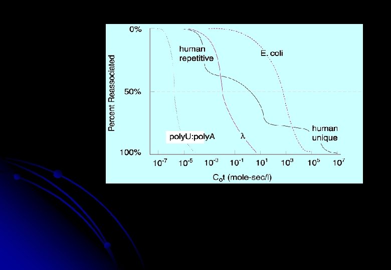Reasociación para Eucariotes ≈ 20 -25% altamente repetitivo: 2 x 106 copias ≈ 25 -30% Moderadamente Repetitivo 350 copias ≈ 45 -55% Copia única > 2 logs: diferentes poblaciones
