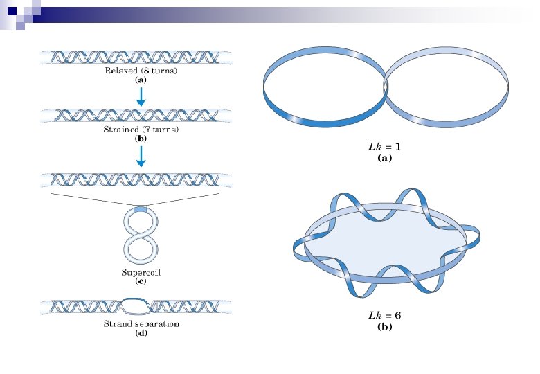 L = T + W Linking Number (L or Lk) = número de veces que dos cadenas están entrelazadas Twists (T or Tw) = número de vueltas de hélice Writhes (W or Wr) = número de veces que el dúplex se entrecruza consigo mismo