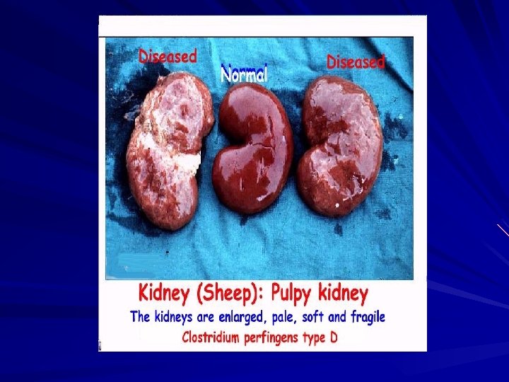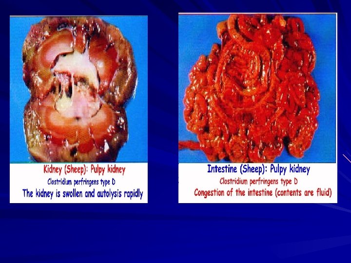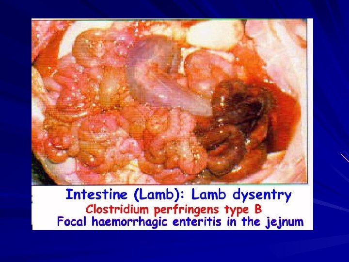 Clostridium perfringens Cl. perfringens type A Major toxins Enterotoxin α- toxin Hosts Disease Clinical Signs human Food poisoning human Calves & lambs Gas gangrene Enterotox-aemia Abdominal pain, nausea & diarrhea without vomiting Gas gangrene Haemorrhagic entritis, diarrhea & death. -Haemorrhagic diarrhea & rapidly fatal enterotoxaemia -Gas gangrene in muscles B α- toxin β- toxin ε- toxin Lamb dysentery C α- toxin Sheep & goat Struck β- toxin chicken Avian Necrotic entritis D α- toxin ε- toxin Adult sheep Pulpy kidney E α- toxin i- toxin Calves & lambs Enterotox-aemia Convulsions, enterotoxaemia & sudden death Diarrhea, enterotoxaemia Death within few hrs vascular damage, particularly of capillaries in the brain & decomposition of kidney & sudden death. Edema & enterotoxaemia