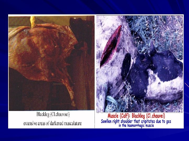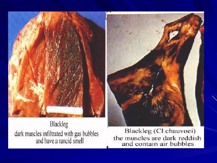 Clostridium chauvoei (Cl. Feseri) It affects cattle mainly & causes black leg (black quarter). In sheep it causes a symptomatic anthrax while equines are resistant The disease is characterized by swellings in the hip, shoulder, chest, back, neck or elsewhere. First the swelling is small, hot and painful. As the disease progresses, the swelling enlarges and becomes spongy and gaseous. If you press the swelling, gas can be felt under the skin. The animal usually dies in 12 to 48 hours.