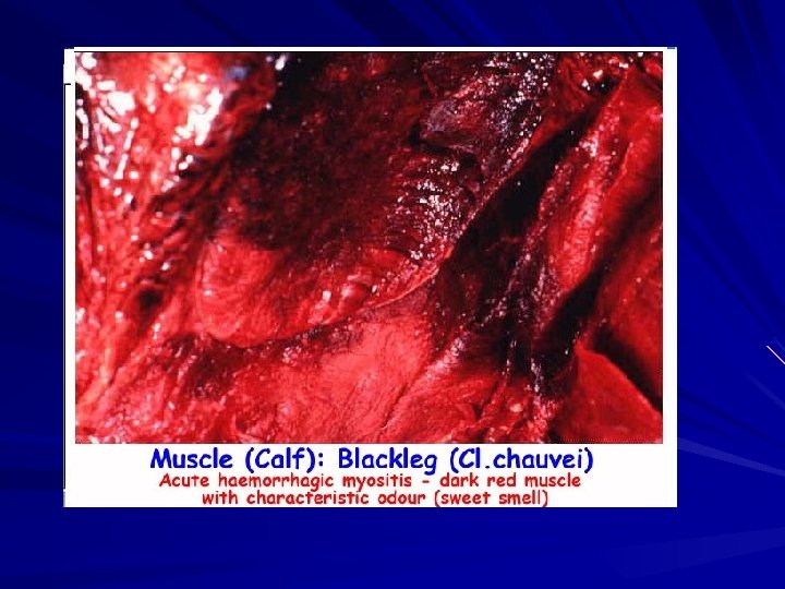 Diagnosis: 1 - Clinical signs and post-mortem examinations of no significance because the course of the disease is similar to that of malignant oedema in cattle and braxy disease in sheep caused by Cl. septicum. 2 - Direct staining with fluorescent labeled antibodies 3 - Isolation and identification see cultural characters and biochemical reactions. 4 - Protection Test: Inject two guinea pigs S/C with 0. 5 -1 ml of 72 hrs old culture or extract from infected muscles. One of them is protected by injection with specific C. chauvoei antiserum. Result: The first guinea pig dies within 72 hrs with oedema at the site of injection with bloody stained serous fluid and the muscles are very dark red in colour with foul odour. The protected one remains alive.