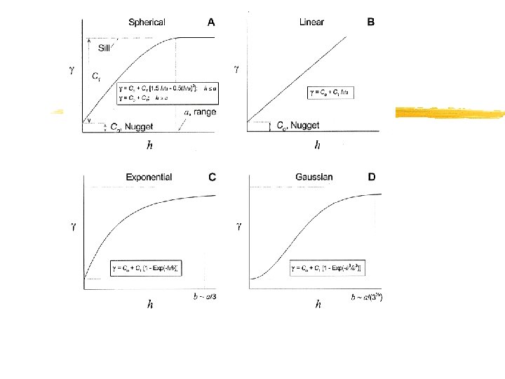 Models in One Direction § The choice of basic models usually depends on the behavior of the sample variogram near the origin: - Parabolic behavior Gaussian - Linear behavior Spherical or Exponential