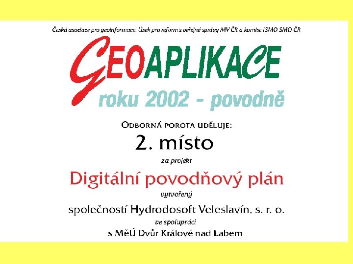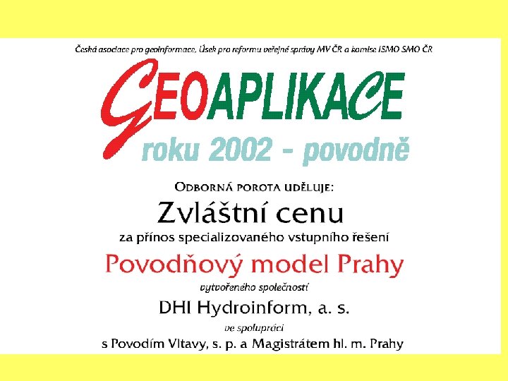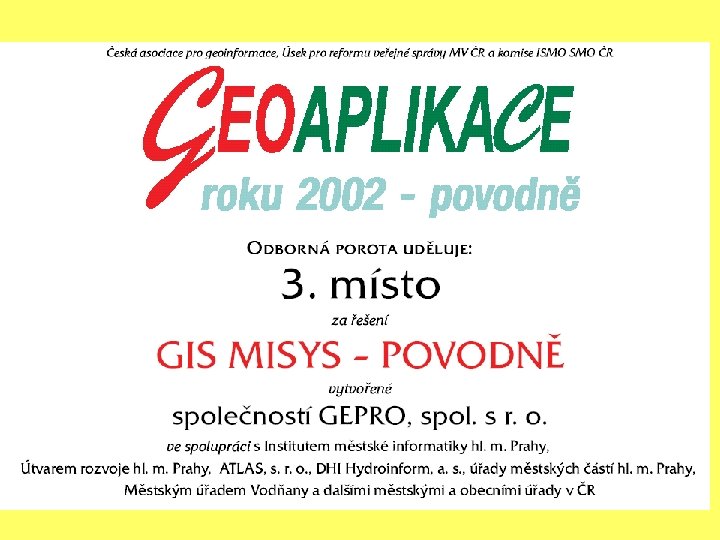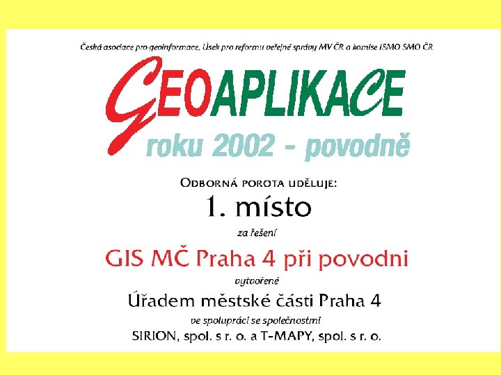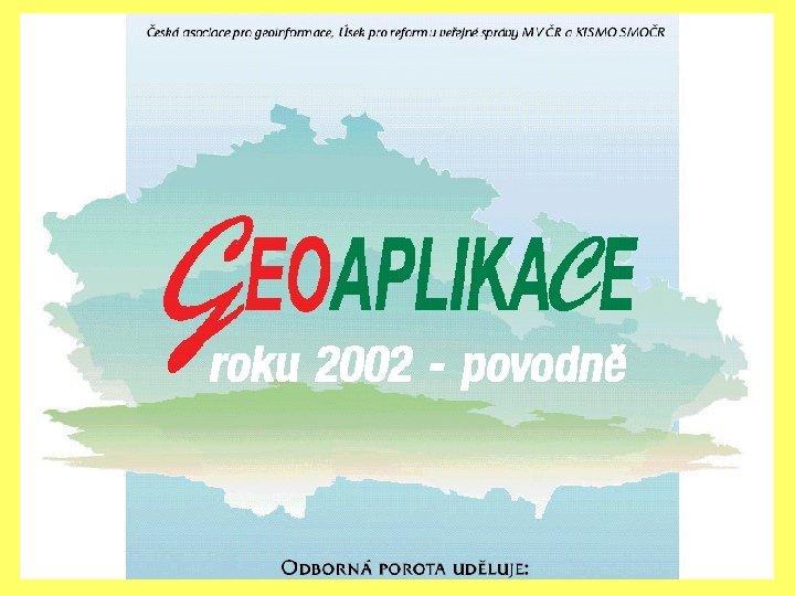 Geoaplikace roku Čtvrtý ročník soutěže o nejlepší využití geodat a geoinformačních technologií ve veřejné správě je mimořádně zaměřen na praktické uplatnění GI(T) při prevenci, krizovém řízení a monitoringu povodní