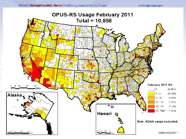 Continuously Operating Reference Stations (CORS) • ~1, 650 GPS / GNSS Stations • 200 organizations • Added 210 Stations – FY 2010 • Data, coordinates, time series plots, photos, metadata, logs, etc. available for FREE from NGS @ geodesy. noaa. gov/CORS/ • 1, 000 files/month downloaded • In FY 2011 NGS will: ü Install 1 “Foundation” CORS to support ITRF connection & improvement ü Install 3 CORS co-located with tide/water level stations CORS Network - (March, 2011)