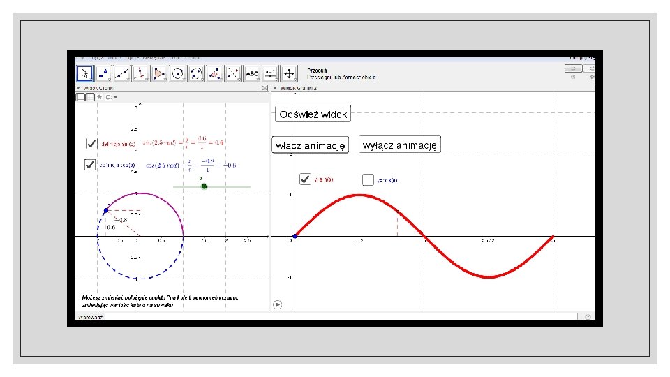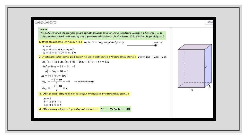 Co zawiera Geo. Gebra? ◦ Geo. Gerba obejmuje wiele funkcji pomagających w rozwiązywaniu zadań. Posiada m. in. kalkulator naukowy, system algebry komputerowej, arkusz kalkulacyjny, aplikację do tworzenia wykresów czy grafik 3 D. Jeżeli masz kłopot w zrozumieniu danego tematu, bez problemu znajdziesz jego opracowanie. Platforma pomaga również nauczycielom w prowadzeniu lekcji.