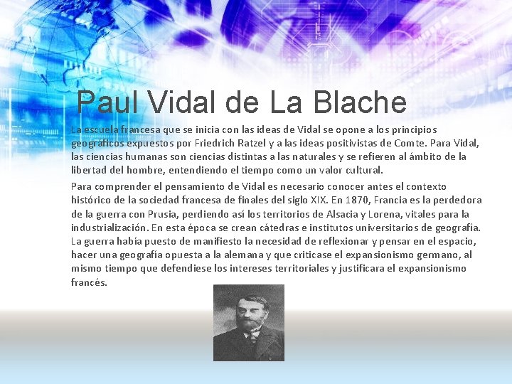 Paul Vidal de La Blache La escuela francesa que se inicia con las ideas de Vidal se opone a los principios geográficos expuestos por Friedrich Ratzel y a las ideas positivistas de Comte. Para Vidal, las ciencias humanas son ciencias distintas a las naturales y se refieren al ámbito de la libertad del hombre, entendiendo el tiempo como un valor cultural. Para comprender el pensamiento de Vidal es necesario conocer antes el contexto histórico de la sociedad francesa de finales del siglo XIX. En 1870, Francia es la perdedora de la guerra con Prusia, perdiendo así los territorios de Alsacia y Lorena, vitales para la industrialización. En esta época se crean cátedras e institutos universitarios de geografía. La guerra había puesto de manifiesto la necesidad de reflexionar y pensar en el espacio, hacer una geografía opuesta a la alemana y que criticase el expansionismo germano, al mismo tiempo que defendiese los intereses territoriales y justificara el expansionismo francés.
