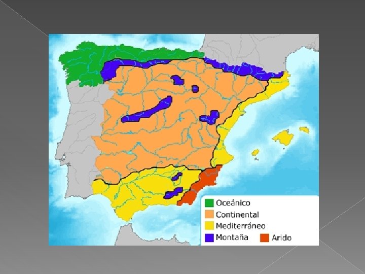Factores climáticos: � LA POSICIÓN DE LA COMUNIDAD VALENCIANA RESPECTO A LA PENÍNSULA: se encuentra en el extremos oriental. En la Península Ibérica predominan los vientos del oeste, lo que repercute directamente en la cantidad de precipitaciones recibidos. Es por eso que en la Comunidad Valenciana las lluvias no son abundantes, porque los relieves peninsulares (Cordillera Cantábrica, la Meseta, el Sistema Central y el Ibérico) dificultan el paso de las borrascas de origen atlántico.