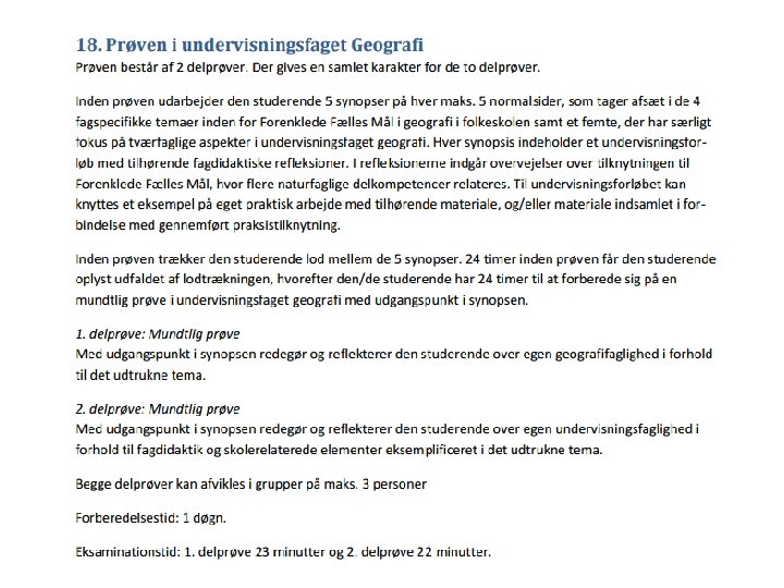 De 5 prøveprodukter • Hvert prøveprodukt skal omhandle en faglig problemstilling, der er relateret til et eller flere af fagets kompetenceområder altså ingen problemformulering eksempler kunne være: • Hvordan kan man tilrettelægge, gennemføre og evaluere undervisning i emnet geomorfologi med særlig henblik på elevernes motivation og naturvidenskabelige arbejde (Især område 1) • Hvordan kan man tilrettelægge, gennemføre og evaluere undervisning med emnet bæredygtighed ud fra et almendannende perspektiv, der fremmer elevernes handlekompetence (Især område 2) • Hvordan kan man tilrettelægge, gennemføre og evaluere et tværfagligt geografiforløb omkring kuldstof i et globalt, regionalt og lokalt perspektiv (især område 3) • Hvordan kan man tilrettelægge, gennemføre og evaluere et regionalgeografisk forløb i et natur- og kulturgeografiske perspektiv (især område 4)