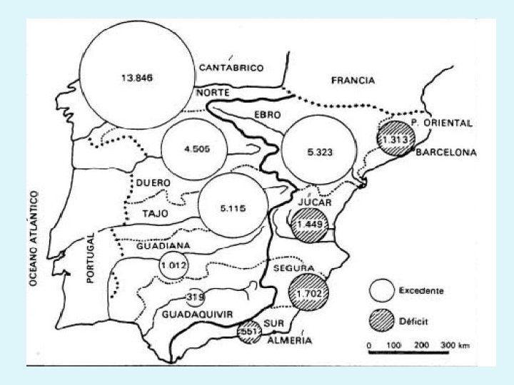La cuenca del Tajo tiene un excedente anual de 5. 115 Hm 3 La cuenca del Ebro tiene un excedente anual de 5. 323 Hm 3 La cuenca del Jucar tiene un deficit anual de 1449 Hm 3 La cuenca del Segura tiene un deficit anual de 1702 Hm 3 La cuenca del Sur tiene un deficit anual de 531 Hm 3 La cuenca de Barcelona tiene un deficit anual de 1313 Hm 3 El Plan Hidrológico, derogado, preveia el transvase de 1000 Hm 3 del agua del Ebro Cataluña. (200 Hm 3), Comunidad Valenciana (300 Hm 3), Murcia (400 Hm 3) y Almeria 100 Hm 3). los beneficiarios del agua debian pagar los gastos de transporte, una parte del cual era para la cuenca que cedia el agua y se hubiera empleado en usos medio ambientales. A largo plazo , el actual Plan hidrológico contempla el transvase del Ródano a Cataluña.