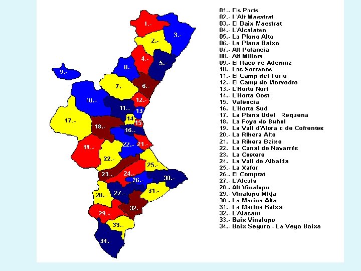 LAS PROVINCIAS DE LA COMUNIDAD VALENCIANA Castellón · El Alto Mijares · El Baix Maestrat · Els Ports · L'Alcalatén · L'Alt Maestrat · El Alto Palancia · La Plana Alta · La Plana Baixa Valencia · El Camp de Morvedre · El Camp de Túria · El Rincón de Ademuz · El Valle de Cofrentes-Ayora · L'Horta Nord · L'Horta Oest · L'Horta Sud · La Canal de Navarrés · La Costera · La Hoya de Buñol · Valencia · La Ribera Alta · La Ribera Baixa · La Safor · La Vall d'Albaida · Los Serranos · La Plana de Utiel. Requena Alicante · El Baix Segura/La Vega Baja · El Baix Vinalopó · El Comtat · El Vinalopó Mitjà/El Vinalopó Medio · L'Alacantí · L'Alcoià · L'Alt Vinalopó/El Alto Vinalopó · La Marina Alta · La Marina Baixa