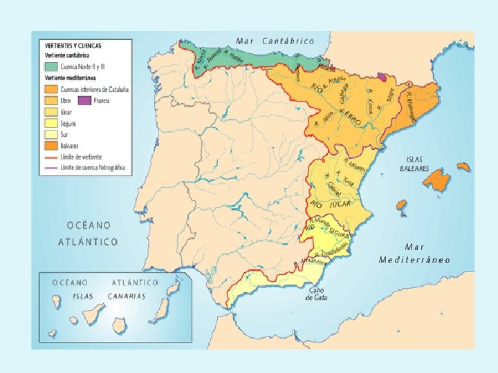 MAPA DE CUENCAS HIDROGRÁFICAS Red hidrográfica: dentro de la cuenca, los ríos trazan su propio cauce (espacio por el que circulan) y crean una red hidrográfica o fluvial que se organiza jerárquicamente desde los subafluentes y afluentes hasta llegar al río principal. La jerarquía de la red marca la importancia creciente de sus elementos.