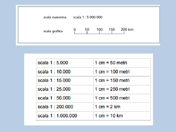 Le scale possono essere di due tipi: la scala numerica e quella grafica. Se trovi una scala che dice: 1: 10 000, vuol dire che un centimetro del disegno è uguale a 10 000 centimetri nella realtà. Questa è una scala numerica, perché sono dei numeri a dire quante volte il disegno è più piccolo della realtà. Se la scala è grafica, è fatta da una linea divisa in parti uguali e puoi vedere da solo a quanto è uguale nella realtà un centimetro della carta.