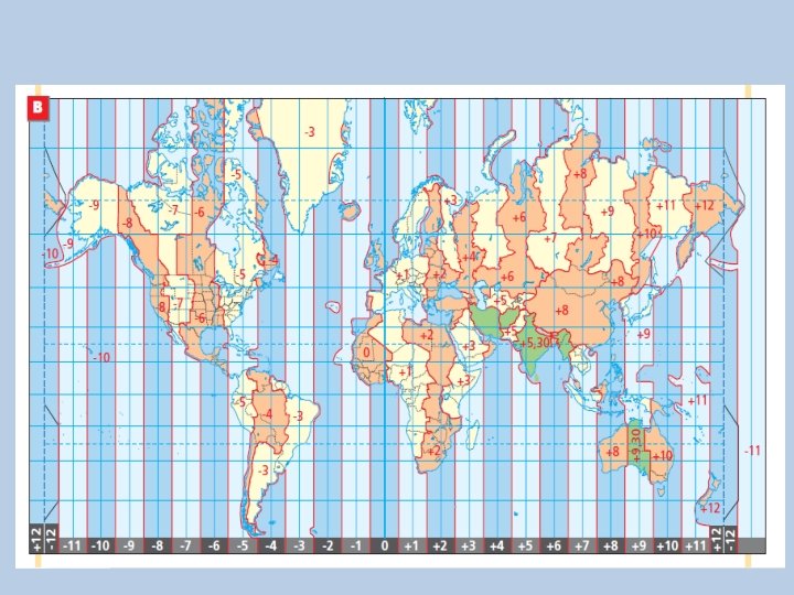 In alto, vedi sulla superficie della Terra delle linee, che la dividono in 24 parti da nord a sud: sono i fusi orari. Qui sopra, vedi i fusi orari sul planisfero (la carta di tutta la Terra). Anche qui gli uomini hanno scelto come fuso orario più importante quello dove c’è il meridiano di Greenwich: si chiama fuso orario zero.
