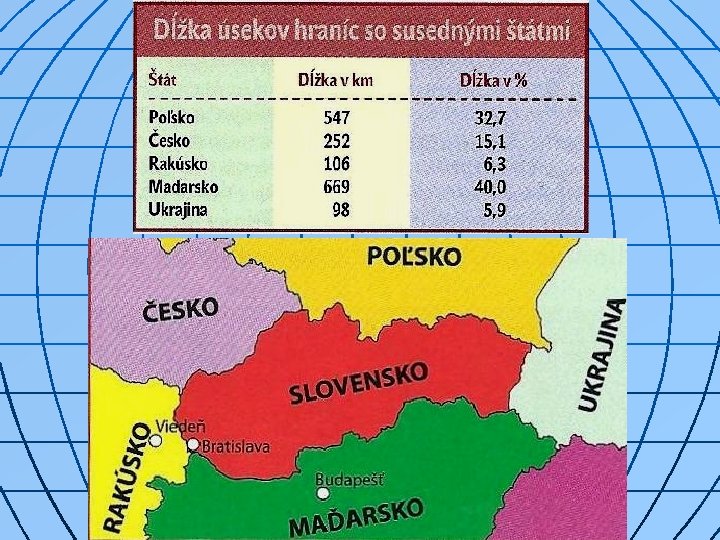 n n n Štátne hranice - celkovo 1 672 km väčšinou prirodzené (75 % - vedú po riekach Morava, Dunaj, Ipeľ a po horských chrbtoch). umelé - na východe s Ukrajinou a Maďarskom. Schengenská hranica (vnútorná) – s Poľskom, Českom, Rakúskom, Maďarskom Schengenská hranica (vonkajšia) – s Ukrajinou