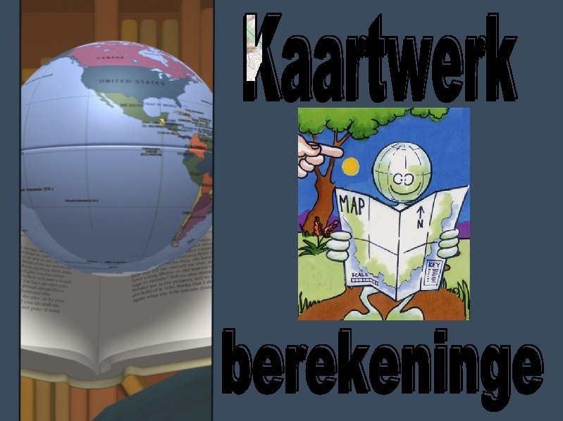 Berekeninge Afstand Area Gradiënt Kaartafstand x Skaal 100 000 Lxb Verskil in Hoogte Afstand Antwoord in km² Geen eenhede(1: 23) Magnetiese peiling Vertikale oordrywing Magnetiese deklinasie Vertikale skaal Horisontale skaal Magnetiese deklinasie Mag N Ware N 23° + 53’ Peiling Antwoord = X Keer