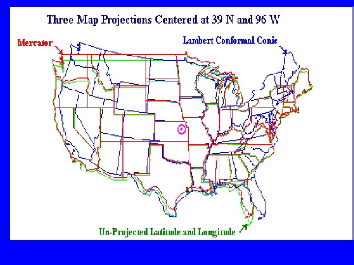• Some map projections minimize distortions in one property on the expense of another, while others balance the overall distortions. • All the data in a GIS database must be in the same map projection. Better to store locations in unprojected coordinates (decimal degrees)