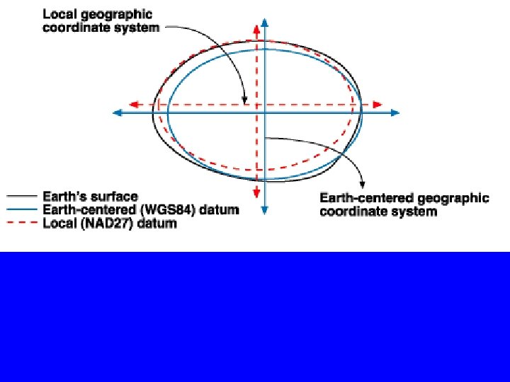 Which ellipsoid? • Define ellipsoid parameters (equations not required): • semi-major axes (a), semi-minor axes (b) e= = first eccentricity • N = normal length = • • Two main ellipsoids in North America: Clarke ellipsoid of 1866, on which NAD 27 is based • Geodetic Reference System of 1980 (GRS 80): on which NAD 83 is based. • For lines up to 50 km, a sphere of equal volume can be used •
