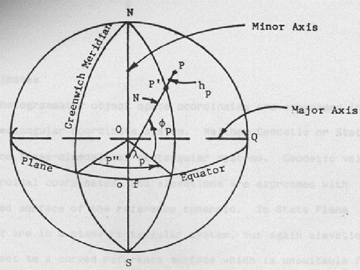 • The locations of map features are referenced to actual locations of the objects they represent in the real world. • The positions of objects on the earth’s spherical (ellipsoidal) surface are usually given in degrees of latitude and longitude, also known as geographic or geodetic coordinates. • On a flat map, the locations of features are measured in a two dimensional planner coordinate system. Examples are state plane coordinate system or UTM.