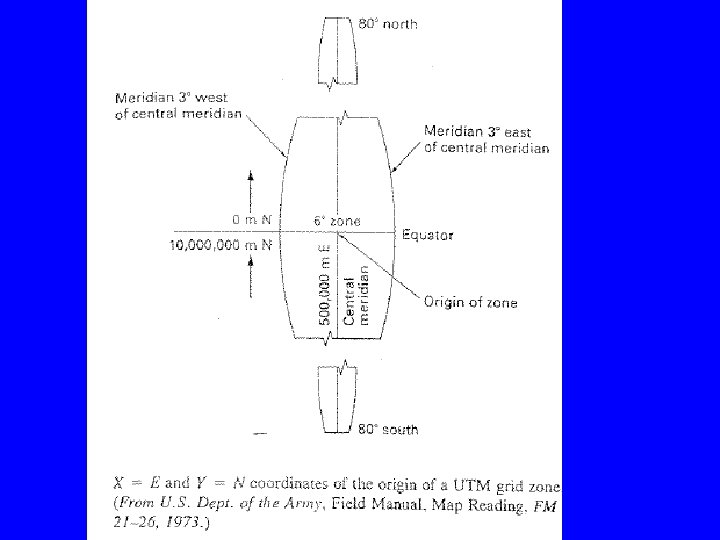 • The origin of longitude is at the central meridian • False easting is 500, 000 m at central meridian. • The origin of latitude is at the equator • False northing is 0 for the northern hemisphere and is 10, 000 m for the southern hemisphere. • A global system used in USGS 1: 250, 000 scale quadrangle map series.