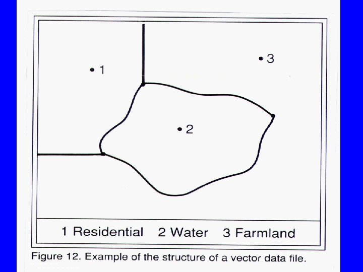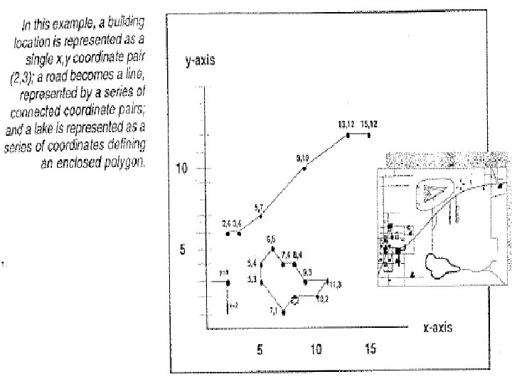 1 - Vector Data • Usually constructed by digitizing a map or a photograph. • Features are represented by pairs of Cartesian coordinates. They can be points, lines, or polygons. – Point features: are represented by discrete locations defining a map object whose boundary or shape is too small to be shown as a line or area feature. A special symbol or label usually depicts a point location. Examples of such features are wells and telephone poles