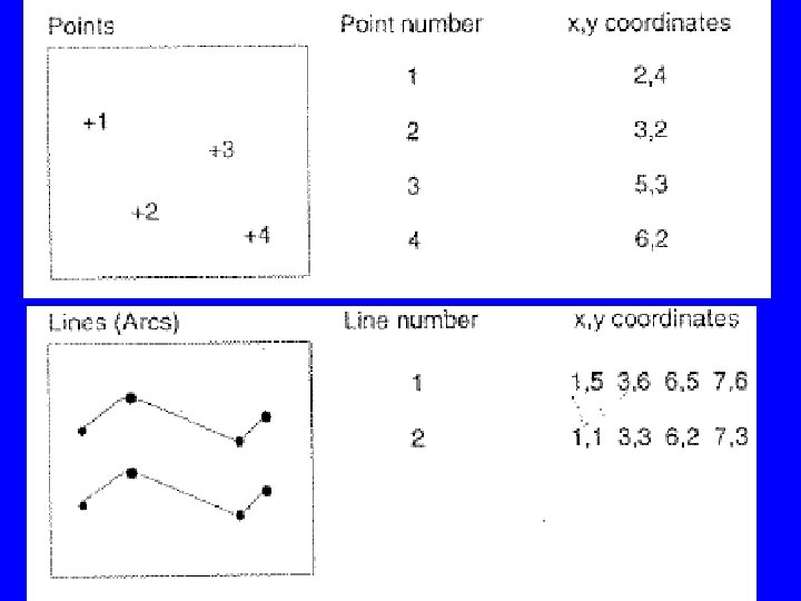 • In vector representation, each points is recorded as a single x, y location. Lines (arcs, or links) are recorded as a series of ordered x, y. Areas are recorded as a series of x, y coordinates defining arcs that enclose the area, first and last points are the same in this case. Areas can also be defined by the arcs around their boundaries, see figures. • This way, features are stored in terms of pairs of x, y coordinates instead of storing a graph. • Multiple features are represented by assigning an ID to each feature and list the pairs of coordinates against feature ID.
