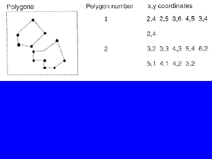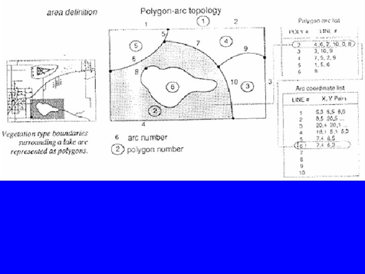 B. 2. Area Definition • Arcs that connect to surround an area define a polygon • Areas can be defined by sets of x, y coordinates. • A more efficient way is to store the ID’s of the arcs defining the area. That allows for storing the arcs only once and insures that boundaries of adjacent polygons do not overlap, see figure. • In this case, we store a polygon-arc list and an arc -coordinates list.