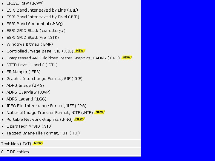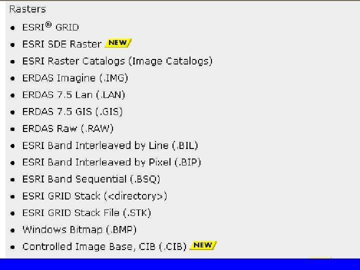 Arc. View supports the following image formats as themes: – ARC Digitized Raster Graphics (ADRG) (if Arc. View's ADRG Image Support extension is loaded) – BMP – BSQ, BIL and BIP – Compressed ARC Digitized Raster Graphics (CADRG) (if Arc. View's CADRG Image Support extension is loaded) – Controlled Image Base (CIB) (if Arc. View's CIB Image Support extension is loaded) – ERDAS – GRID