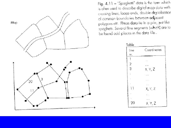 I- Vector Data Structures Vector data usually come in one of two data structures: A- Spaghetti • digital map data with crossing lines, loose ends, open shapes, double boundaries, etc. The data lie in a pile, just like spaghetti, see attached figure. • Takes large space to store and very hard to search through. • Not suitable for most GIS applications, no overlaying possible for example.