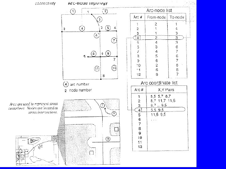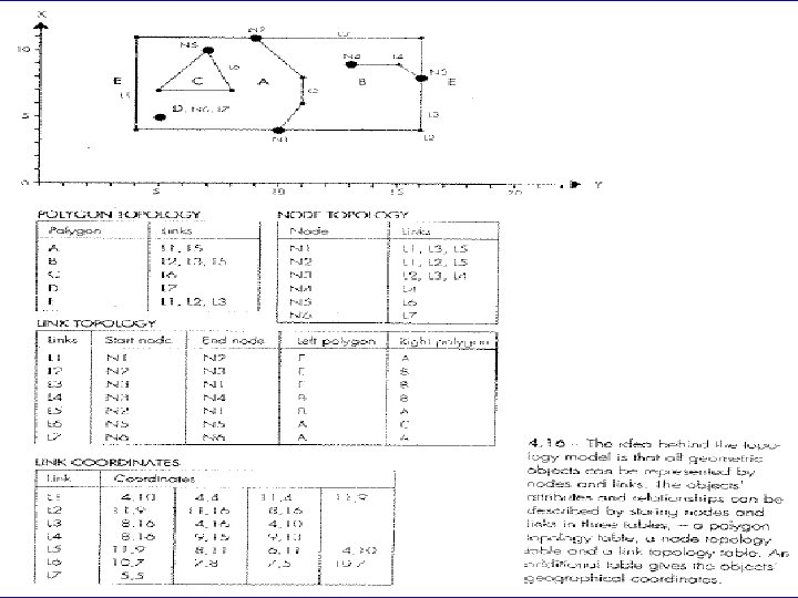 • Other topological data structures, see figure. • In summary, topological data structures define how points, lines, and polygons are related to each other on a map. • This relationship is obvious to the human eye, but needs to be explicitly defined to a computer. • Topological data structures may vary from a software to another, but they usually carry the same basic information.
