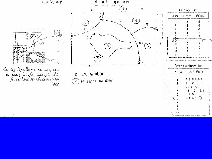 B. 3. Contiguity • Contiguity: arcs have directions, right and left arc; and each arc has a direction from the fromnode to the to-node. • A GIS software may store a left-right list which defines the polygons on the left and right sides of each arc, see figure. • Polygons sharing a common arc are adjacent. The left-right list describes the spatial arrangement of the areas, which one is to the left?