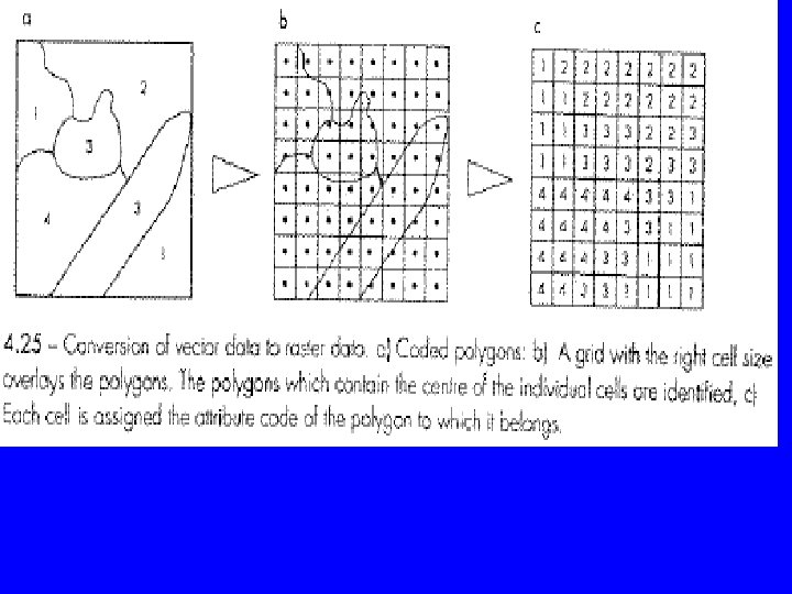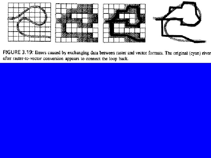 • A single cell may cover parts of two or more objects or values. A classification scheme is followed to assign a value to the cell: average, largest, the one in the middle, etc. , figure 4 -18