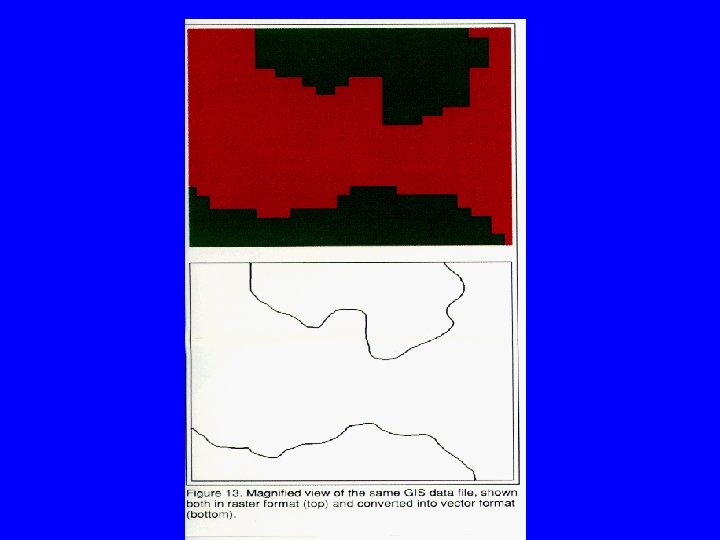 • Vectorisation and rasterisation – transforming raster into vector or vector into raster format respectively. – can be done automatically within the software – part of the data is lost in the transformation process, why? Figures 4 -24, and 4 -25