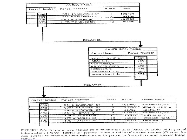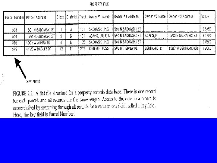 III- Database Structures • A data base is simply a collection of multiple files. • A GIS is, first and foremost, an information system • There is a need for an efficient data management system to facilitate the integration and cross referencing between different types of data. 1 - Flat Files – All the information about a feature are stored in a single record. All rows have the same number of columns which may result in empty cells. – Search is done through a key field (attribute) – A structure that results in a slow system that requires huge storage. Fig 2. 3 of Huxhold