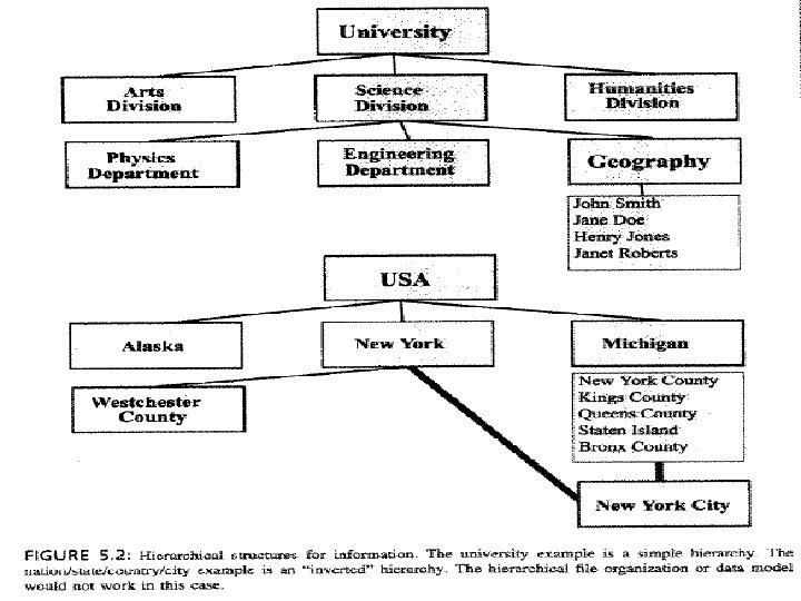 2 - Hierarchical Files – More than one type of record in the data base (many tables) – One record can be a parent of one or more records in another table through pointers. – One way relationship which reduces repetition of information. – Each record can have one parent only. – Very useful in one-to-many situations, Arc. GIS will append the first maching record only in that case. – Allows limited linking process, pointers are pre-set in the design.