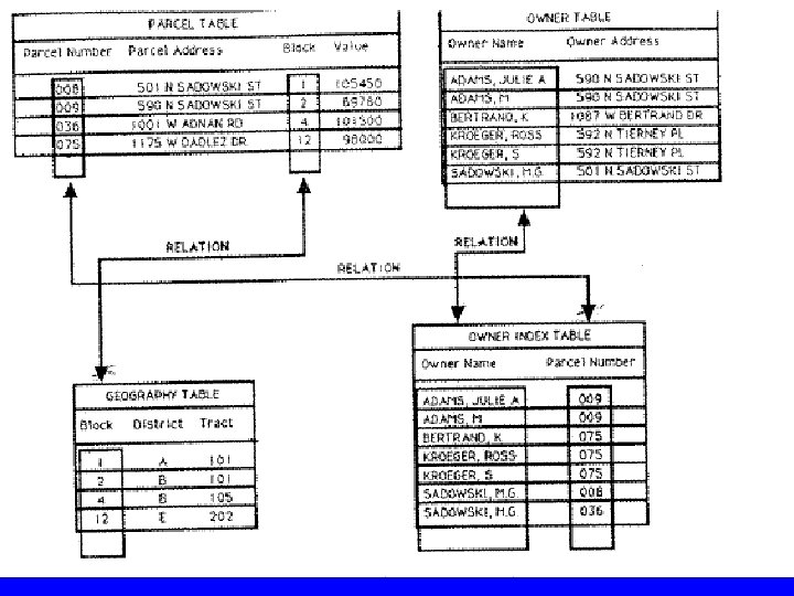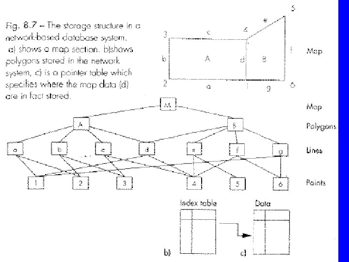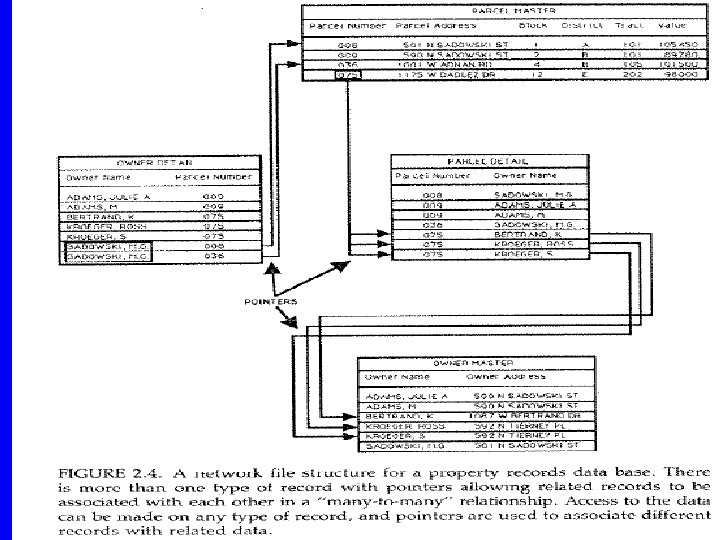 3 - Networks – Records are not necessarily unique. One feature having more than one value of a certain attribute may show up twice. For example, owners of many parcels. – Pointers allow many-to-many relationship, one record may have more than one parent. Still one way relationship. – Pointers may become very complicated and may occupy larger space than the data itself. Figure 8 -7 Tor.