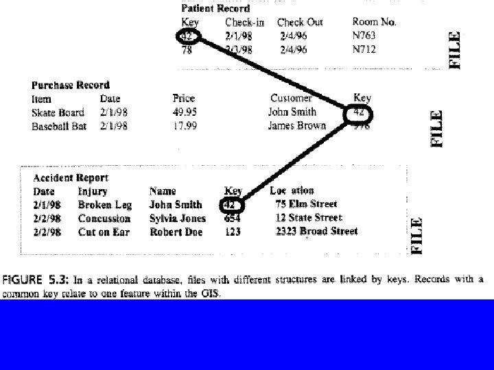 4 - Relational databases – Allows related records from different files to be associated with each other through a common attribute without pointers between the records (the rows) – They contain a group of flat files that can be related in any direction. – Tables can be joined to form new tables by choosing any common field (column) – Fast and flexible structure. Does not require large storage for the links. – Figures 2. 5 and 2. 6 of Huxhold. – The most common data base structure in modern GIS software. Definition: Relational Data Base A data model based on set theory. Each set has elements that can be uniquely defined by a primary key. A table (relation) stores all records for a set. Each record in a table has the same columns for attribute values. Relationships between tables are constructed by storing the key to a record in the other table