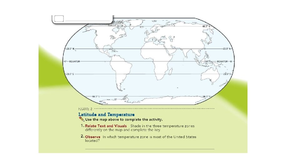 Climate and Latitude • In general areas closer to the equator have warmer climates than areas farther away.