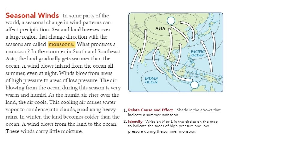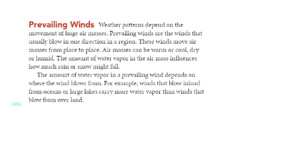 Climate and Topography (land masses) • The amount of precipitation that falls in area can vary yearly. But, over time, total precipitation tends toward a yearly average. • The main factors that affect the amount of precipitation in some climates are prevailing winds, presence of mountains, and seasonal winds.