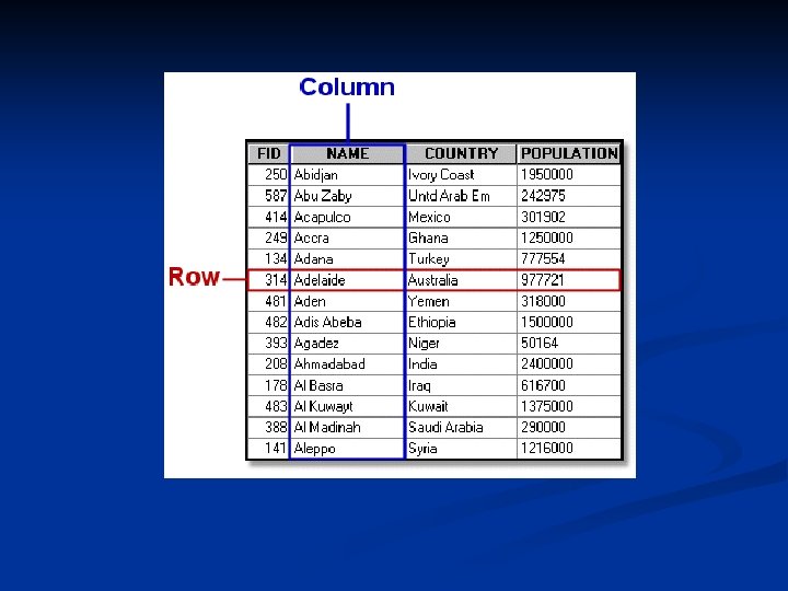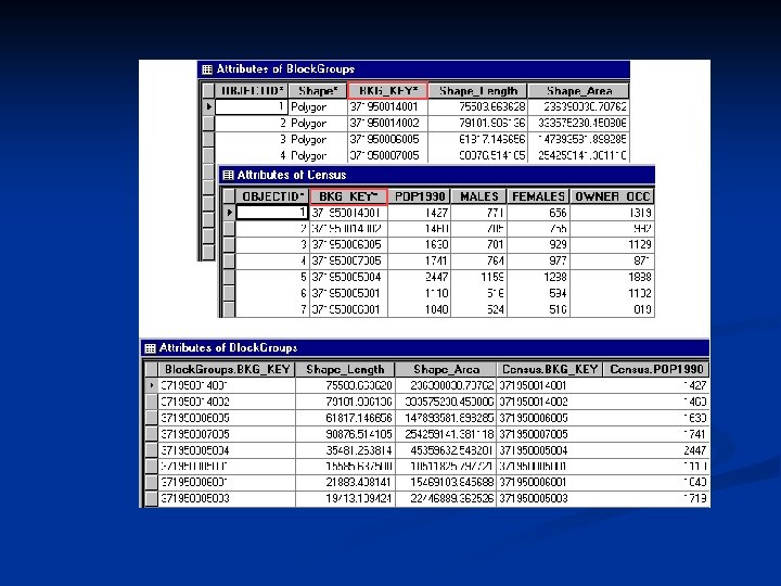 Anatomy of a Table n n Each table in a database has the same basic format: an array of rows and columns. Rows are also called records, and columns are also called fields. Some tables, like a feature class's default feature attribute table, have a preset number of columns. For instance, a polygon coverage's feature attribute table has four standard columns: Area, Perimeter, Coverage#, and Coverage-ID, while a line shapefile's feature attribute table has only one default column, named Shape. Other tables are completely userdefined.